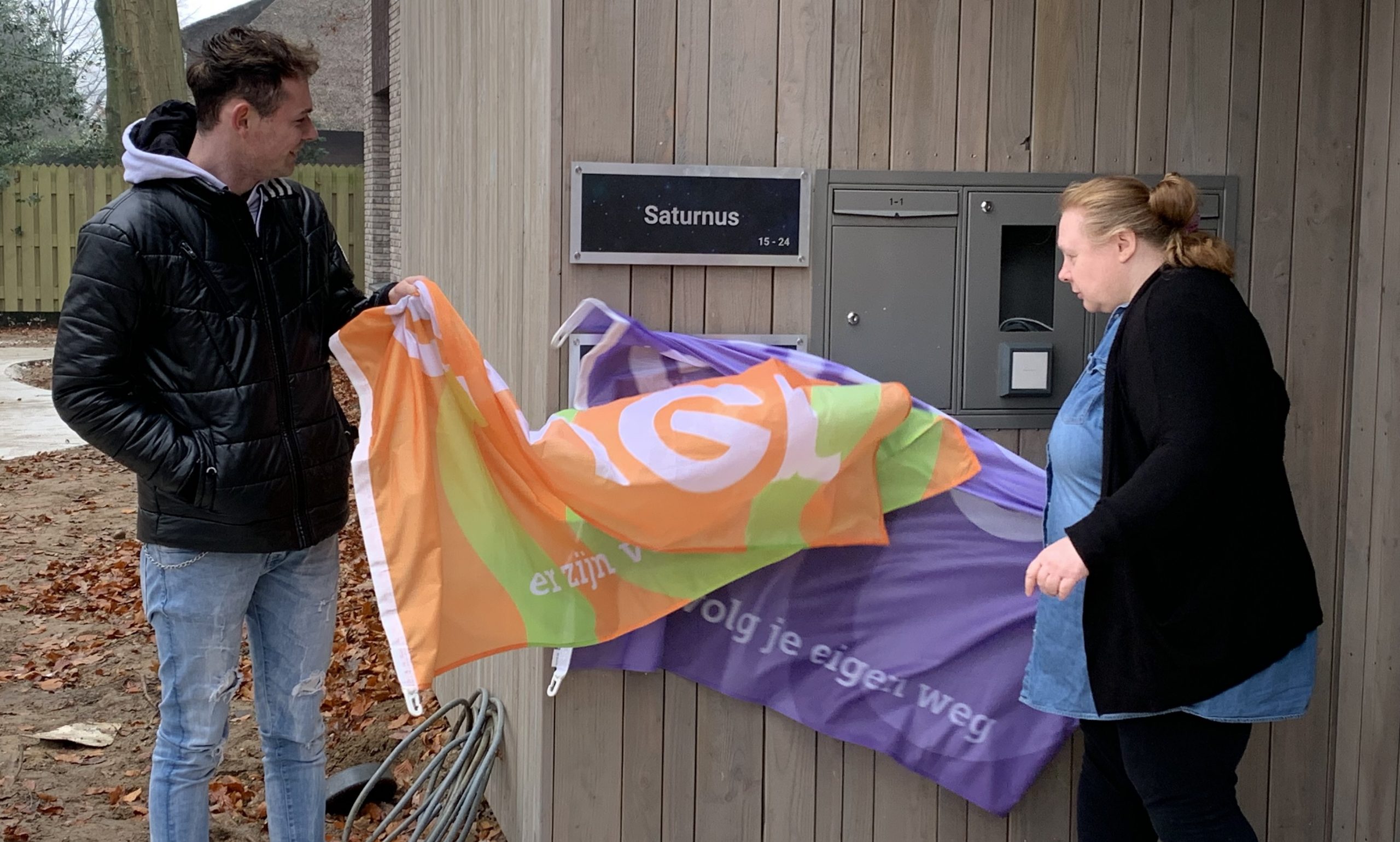 Twee bewoners onthulden de namen (Saturnus en Neptunus) van de eerste woningen die in het door de bewoners gekozen thema Heelal staan.